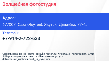 Волшебная фотостудия по адресу 677007, Саха (Якутия), Якутск, Дежнёва, 77/4а в дальнейшем Организация, размещена в следующих категориях:
