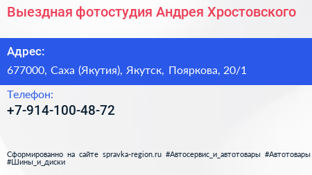 Выездная фотостудия Андрея Хростовского по адресу 677000, Саха (Якутия), Якутск, Пояркова, 20/1 в дальнейшем Организация, размещена в следующих категориях: