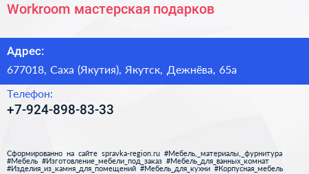Workroom, мастерская подарков по адресу 677018, Саха (Якутия), Якутск, Дежнёва, 65а в дальнейшем Организация, размещена в следующих категориях: