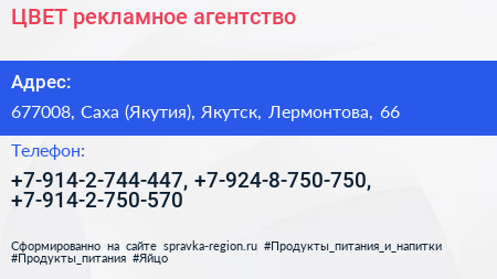 ЦВЕТ, рекламное агентство по адресу 677008, Саха (Якутия), Якутск, Лермонтова, 66 в дальнейшем Организация, размещена в следующих категориях: