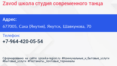 Zavod, школа-студия современного танца по адресу 677005, Саха (Якутия), Якутск, Шавкунова, 70 в дальнейшем Организация, размещена в следующих категориях: