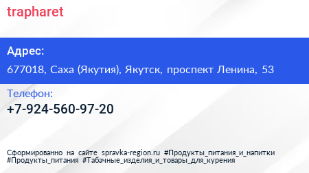 trapharet по адресу 677018, Саха (Якутия), Якутск, проспект Ленина, 53 в дальнейшем Организация, размещена в следующих категориях: