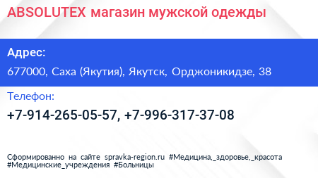 ABSOLUTEX, магазин мужской одежды по адресу 677000, Саха (Якутия), Якутск, Орджоникидзе, 38 в дальнейшем Организация, размещена в следующих категориях: