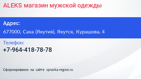 ALEKS, магазин мужской одежды по адресу 677000, Саха (Якутия), Якутск, Курашова, 4 в дальнейшем Организация, размещена в следующих категориях: