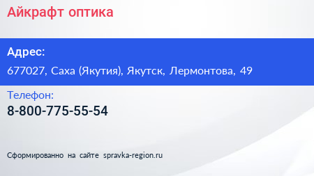 Айкрафт, оптика по адресу 677027, Саха (Якутия), Якутск, Лермонтова, 49 в дальнейшем Организация, размещена в следующих категориях: