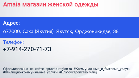 Amaia, магазин женской одежды по адресу 677000, Саха (Якутия), Якутск, Орджоникидзе, 38 в дальнейшем Организация, размещена в следующих категориях: