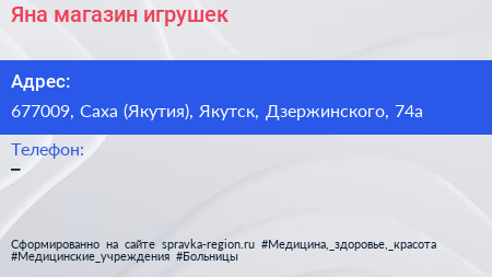 Яна, магазин игрушек по адресу 677009, Саха (Якутия), Якутск, Дзержинского, 74а в дальнейшем Организация, размещена в следующих категориях: