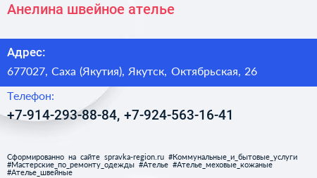 Анелина, швейное ателье по адресу 677027, Саха (Якутия), Якутск, Октябрьская, 26 в дальнейшем Организация, размещена в следующих категориях: