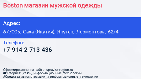 Boston, магазин мужской одежды по адресу 677005, Саха (Якутия), Якутск, Лермонтова, 62/4 в дальнейшем Организация, размещена в следующих категориях: