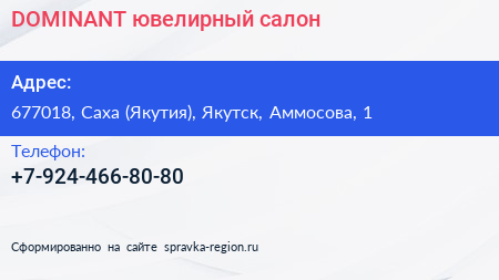 DOMINANT, ювелирный салон по адресу 677018, Саха (Якутия), Якутск, Аммосова, 1 в дальнейшем Организация, размещена в следующих категориях: