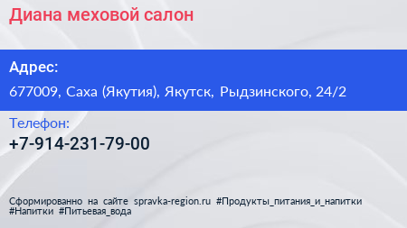 Диана, меховой салон по адресу 677009, Саха (Якутия), Якутск, Рыдзинского, 24/2 в дальнейшем Организация, размещена в следующих категориях: