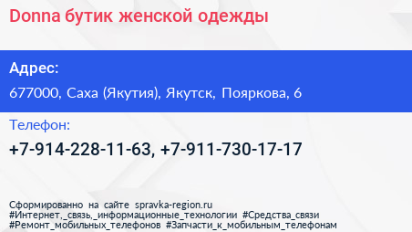 Donna, бутик женской одежды по адресу 677000, Саха (Якутия), Якутск, Пояркова, 6 в дальнейшем Организация, размещена в следующих категориях: