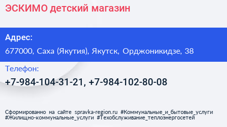 ЭСКИМО, детский магазин по адресу 677000, Саха (Якутия), Якутск, Орджоникидзе, 38 в дальнейшем Организация, размещена в следующих категориях: