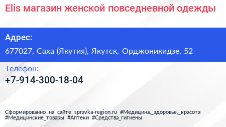 Elis, магазин женской повседневной одежды по адресу 677027, Саха (Якутия), Якутск, Орджоникидзе, 52 в дальнейшем Организация, размещена в следующих категориях: