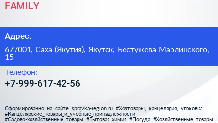 FAMILY по адресу 677001, Саха (Якутия), Якутск, Бестужева-Марлинского, 15 в дальнейшем Организация, размещена в следующих категориях: