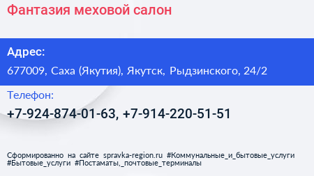 Фантазия, меховой салон по адресу 677009, Саха (Якутия), Якутск, Рыдзинского, 24/2 в дальнейшем Организация, размещена в следующих категориях: