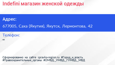 Indefini, магазин женской одежды по адресу 677005, Саха (Якутия), Якутск, Лермонтова, 42 в дальнейшем Организация, размещена в следующих категориях: