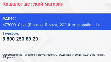 Кашалот, детский магазин по адресу 677000, Саха (Якутия), Якутск, 202-й микрорайон, 1а в дальнейшем Организация, размещена в следующих категориях: