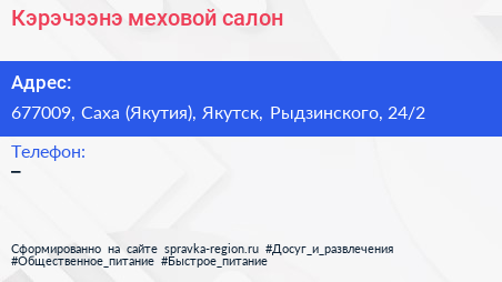 Кэрэчээнэ, меховой салон по адресу 677009, Саха (Якутия), Якутск, Рыдзинского, 24/2 в дальнейшем Организация, размещена в следующих категориях: