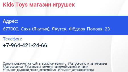 Kids Toys, магазин игрушек по адресу 677000, Саха (Якутия), Якутск, Фёдора Попова, 23 в дальнейшем Организация, размещена в следующих категориях: