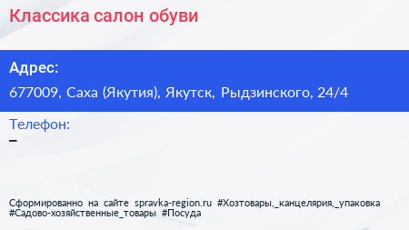 Классика, салон обуви по адресу 677009, Саха (Якутия), Якутск, Рыдзинского, 24/4 в дальнейшем Организация, размещена в следующих категориях: