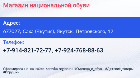 Магазин национальной обуви по адресу 677027, Саха (Якутия), Якутск, Петровского, 12 в дальнейшем Организация, размещена в следующих категориях: