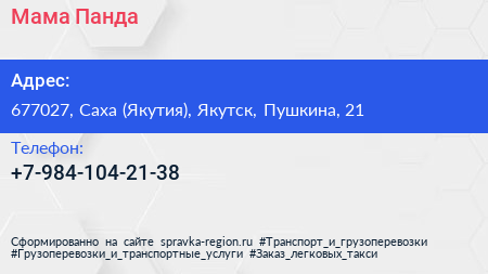 Мама Панда по адресу 677027, Саха (Якутия), Якутск, Пушкина, 21 в дальнейшем Организация, размещена в следующих категориях: