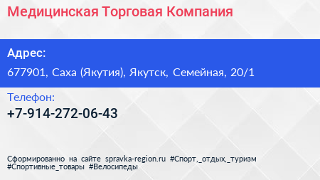 Медицинская Торговая Компания по адресу 677901, Саха (Якутия), Якутск, Семейная, 20/1 в дальнейшем Организация, размещена в следующих категориях:
