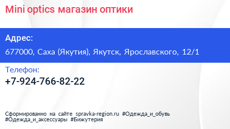 Mini optics, магазин оптики по адресу 677000, Саха (Якутия), Якутск, Ярославского, 12/1 в дальнейшем Организация, размещена в следующих категориях: