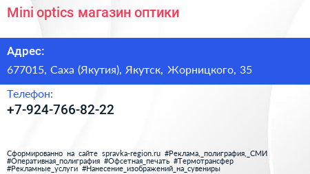 Mini optics, магазин оптики по адресу 677015, Саха (Якутия), Якутск, Жорницкого, 35 в дальнейшем Организация, размещена в следующих категориях:
