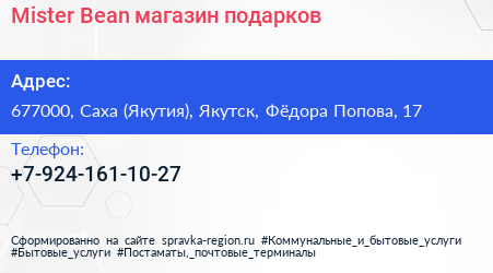 Mister Bean, магазин подарков по адресу 677000, Саха (Якутия), Якутск, Фёдора Попова, 17 в дальнейшем Организация, размещена в следующих категориях: