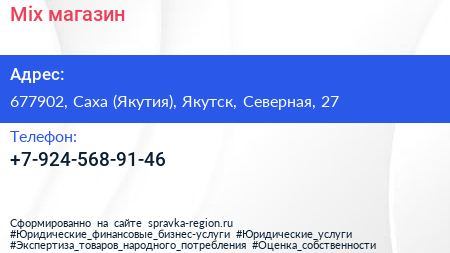 Mix, магазин по адресу 677902, Саха (Якутия), Якутск, Северная, 27 в дальнейшем Организация, размещена в следующих категориях: