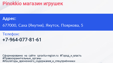 Pinokkio, магазин игрушек по адресу 677000, Саха (Якутия), Якутск, Пояркова, 5 в дальнейшем Организация, размещена в следующих категориях: