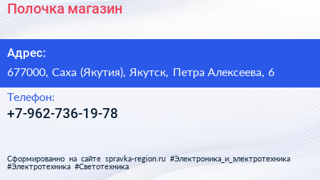 Полочка, магазин по адресу 677000, Саха (Якутия), Якутск, Петра Алексеева, 6 в дальнейшем Организация, размещена в следующих категориях: