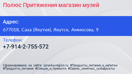 Полюс Притяжения, магазин-музей по адресу 677018, Саха (Якутия), Якутск, Аммосова, 9 в дальнейшем Организация, размещена в следующих категориях: