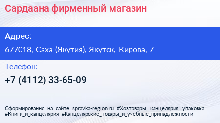 Сардаана, фирменный магазин по адресу 677018, Саха (Якутия), Якутск, Кирова, 7 в дальнейшем Организация, размещена в следующих категориях: