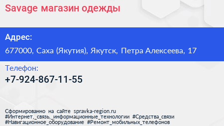 Savage, магазин одежды по адресу 677000, Саха (Якутия), Якутск, Петра Алексеева, 17 в дальнейшем Организация, размещена в следующих категориях: