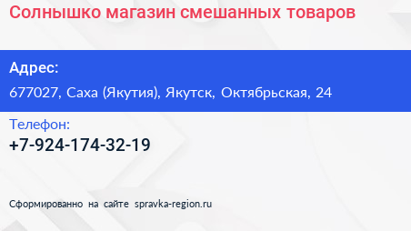 Солнышко, магазин смешанных товаров по адресу 677027, Саха (Якутия), Якутск, Октябрьская, 24 в дальнейшем Организация, размещена в следующих категориях: