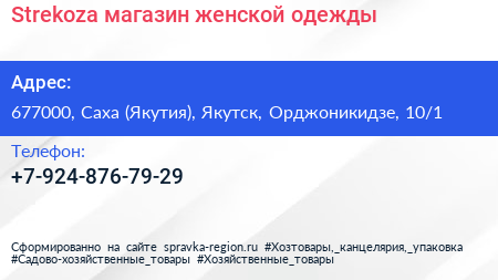 Strekoza, магазин женской одежды по адресу 677000, Саха (Якутия), Якутск, Орджоникидзе, 10/1 в дальнейшем Организация, размещена в следующих категориях: