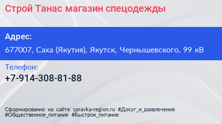 Строй-Танас, магазин спецодежды по адресу 677007, Саха (Якутия), Якутск, Чернышевского, 99 кВ в дальнейшем Организация, размещена в следующих категориях: