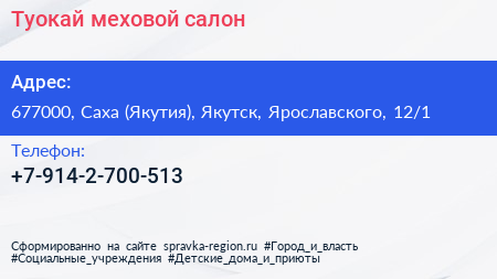 Туокай, меховой салон по адресу 677000, Саха (Якутия), Якутск, Ярославского, 12/1 в дальнейшем Организация, размещена в следующих категориях:
