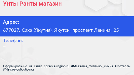 Унты-Ранты, магазин по адресу 677027, Саха (Якутия), Якутск, проспект Ленина, 25 в дальнейшем Организация, размещена в следующих категориях: