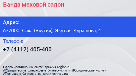 Ванда, меховой салон по адресу 677000, Саха (Якутия), Якутск, Курашова, 4 в дальнейшем Организация, размещена в следующих категориях: