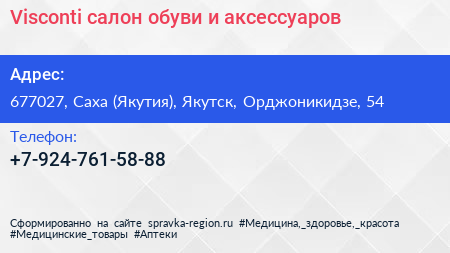 Visconti, салон обуви и аксессуаров по адресу 677027, Саха (Якутия), Якутск, Орджоникидзе, 54 в дальнейшем Организация, размещена в следующих категориях: