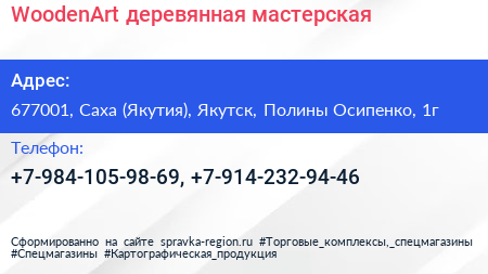 WoodenArt, деревянная мастерская по адресу 677001, Саха (Якутия), Якутск, Полины Осипенко, 1г в дальнейшем Организация, размещена в следующих категориях: