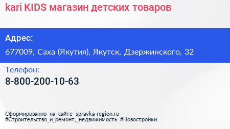 kari KIDS, магазин детских товаров по адресу 677009, Саха (Якутия), Якутск, Дзержинского, 32 в дальнейшем Организация, размещена в следующих категориях: