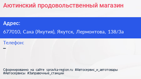 Аютинский, продовольственный магазин по адресу 677010, Саха (Якутия), Якутск, Лермонтова, 138/3а в дальнейшем Организация, размещена в следующих категориях: