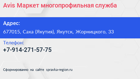 Avis Маркет, многопрофильная служба по адресу 677015, Саха (Якутия), Якутск, Жорницкого, 33 в дальнейшем Организация, размещена в следующих категориях: