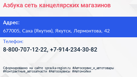 Азбука, сеть канцелярских магазинов по адресу 677005, Саха (Якутия), Якутск, Лермонтова, 42 в дальнейшем Организация, размещена в следующих категориях:
