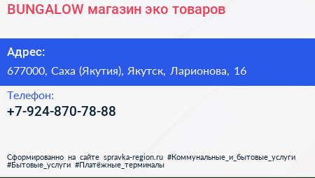 BUNGALOW, магазин эко-товаров по адресу 677000, Саха (Якутия), Якутск, Ларионова, 16 в дальнейшем Организация, размещена в следующих категориях: